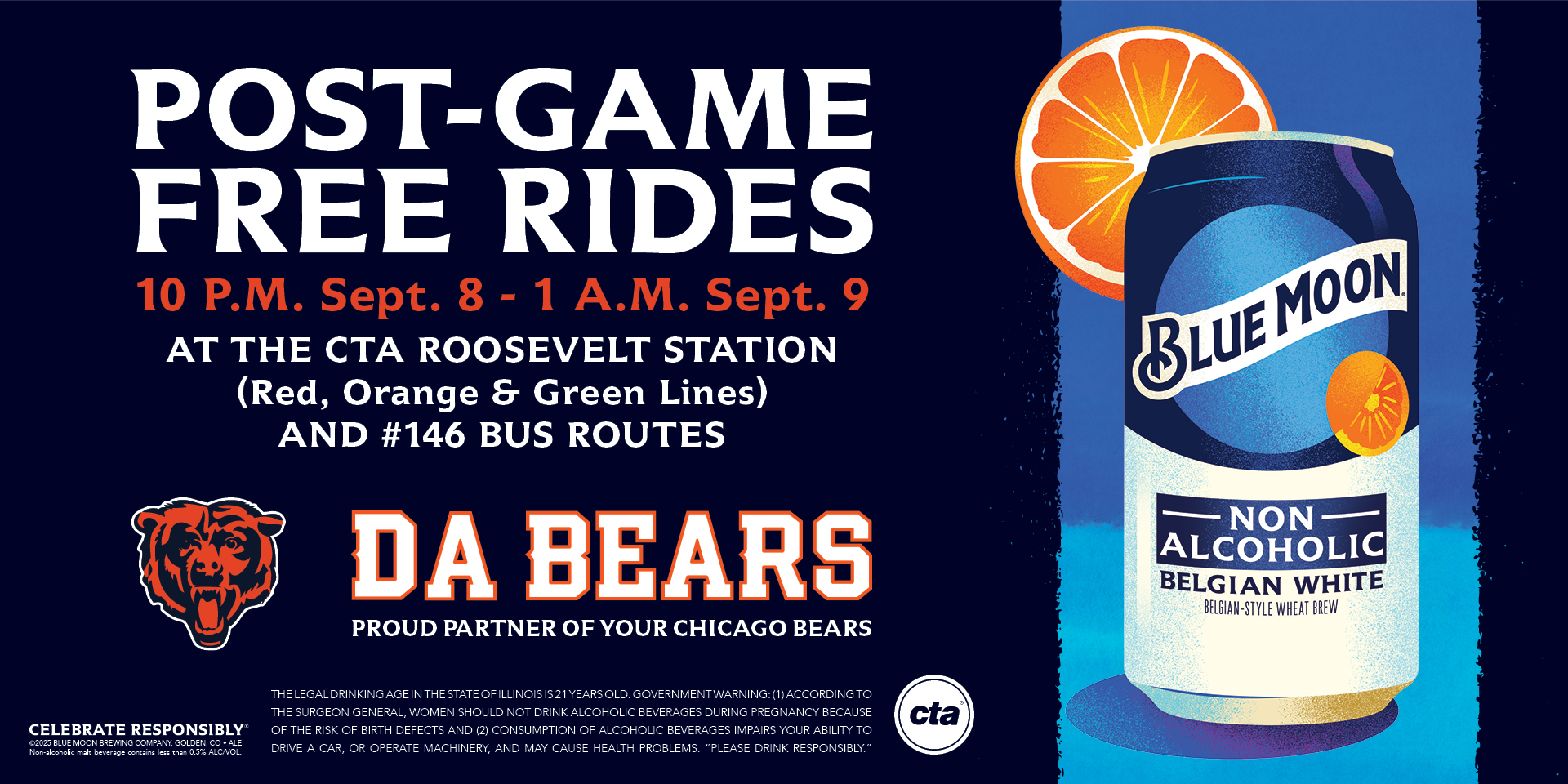 Celebrate responsibly after tonight's game! Miller Lite, the official beer partner of the Chicago Bears, is providing fans a free ride home from 10:00 PM - 1:00 am at the CTA Roosevelt Station and on the #146 bus route. Learn more.